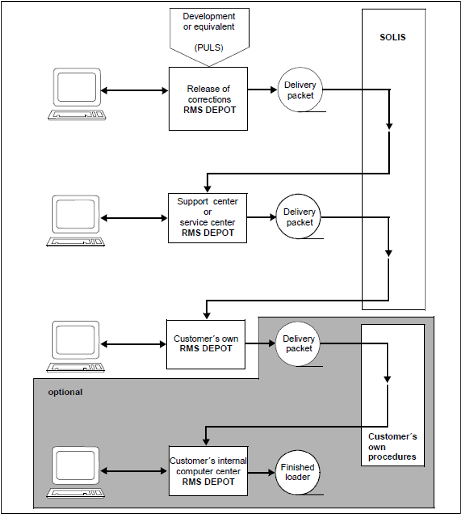 From the depot, in turn an RMS delivery packet can be generated to be forwarded to the next user group. It is forwarded via SOLIS or the customer’s own procedure. The next user group then uses RMS to import this RMS delivery packet into its depot and edit it further, if required.