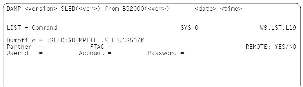 YES | If YES is marked, new input fields are offered in lines 7 and 8 in which the options for the file transfer must be specified (see figure 60). There is no default for these options. The name of the output file to be sent via file transfer is generated automatically by DAMP ( The target computer must be entered in the “Partner” field. The file transfer authorization can be specified using the name of an FTAC profile or explicitly by means of a user ID, account number and password. |