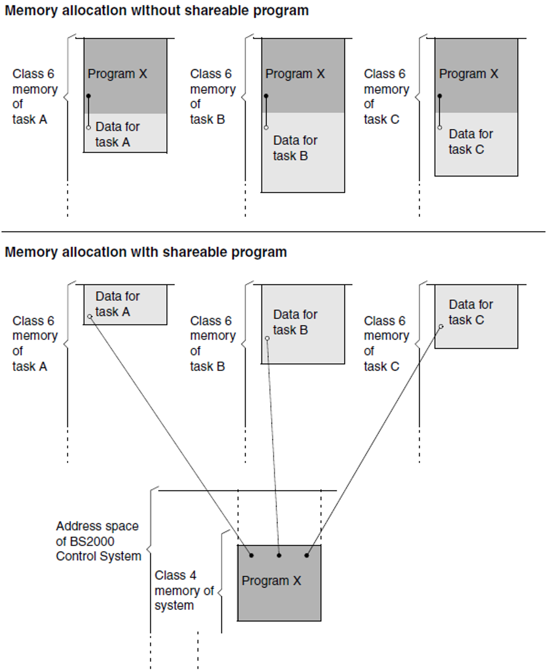 Each module executed by a user is loaded into either the task-local class 6 memory or the memory for shareable programs (shared code). The modules in the task-local class 6 memory can be executed only by the task which caused them to be loaded there. These modules form the so-called private part of the program.