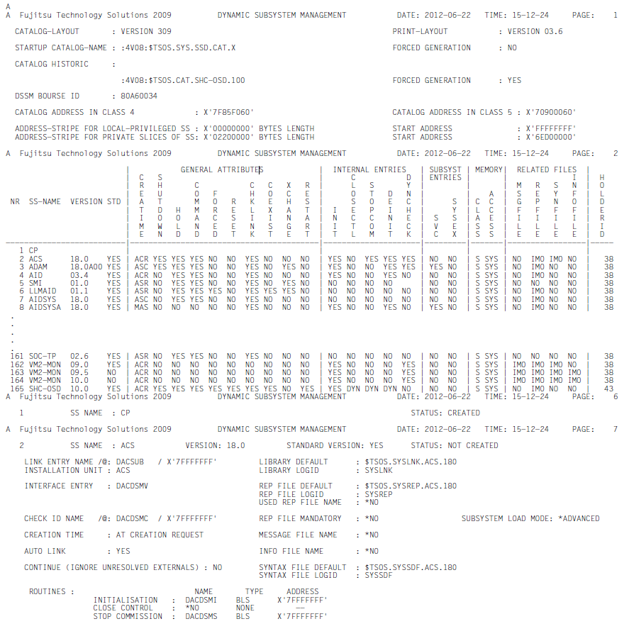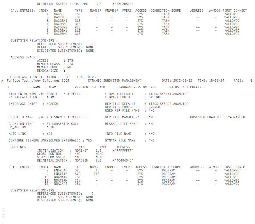 The SHOW-SUBSYSTEM-INFO command allows systems support staff to request information relating to the current subsystem configuration. The output, which is to SYSLST only, comprises the complete description of all known subsystems, including the following dynamic aspects: