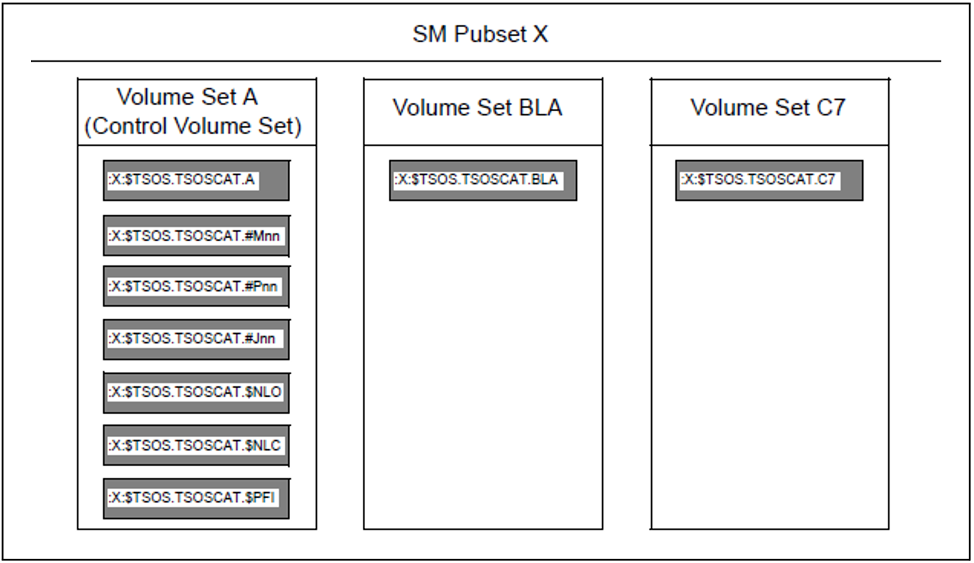 Each volume set of an SM pubset contains a volume-set-specific catalog file with the catalog entries for the files stored on it. The path name of the volume-set-specific catalog file is composed of the pubset ID and the volume set ID, as follows: :<catid>:$TSOS.TSOSCAT.<volume-set-id>.