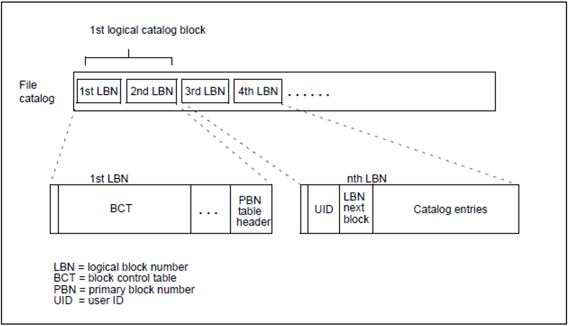 The first catalog block (4K block) contains data for management of the file catalog. The catalog entries (CEs) are stored in the subsequent catalog blocks. The catalog is structured according to user IDs. Any given block of a catalog contains only CEs of one user ID; the CEs are stored sequentially and unsorted. If there is not enough space in the block to accommodate additional CEs, another block is requested and chained to the last block of this user ID.