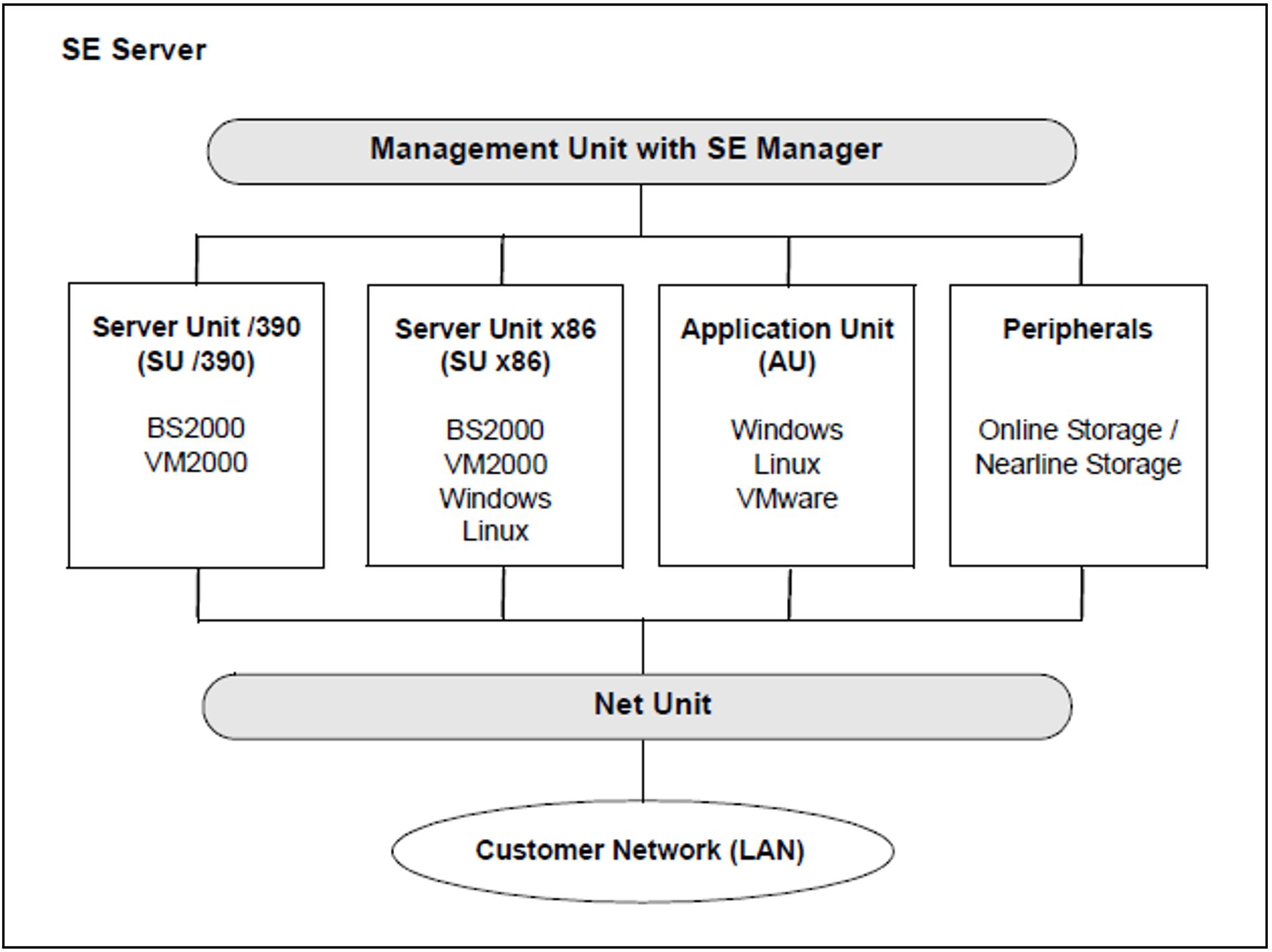 A Fujitsu BS2000 server of the SE series (for short: SE server) consists of the following components in its maximum configuration: