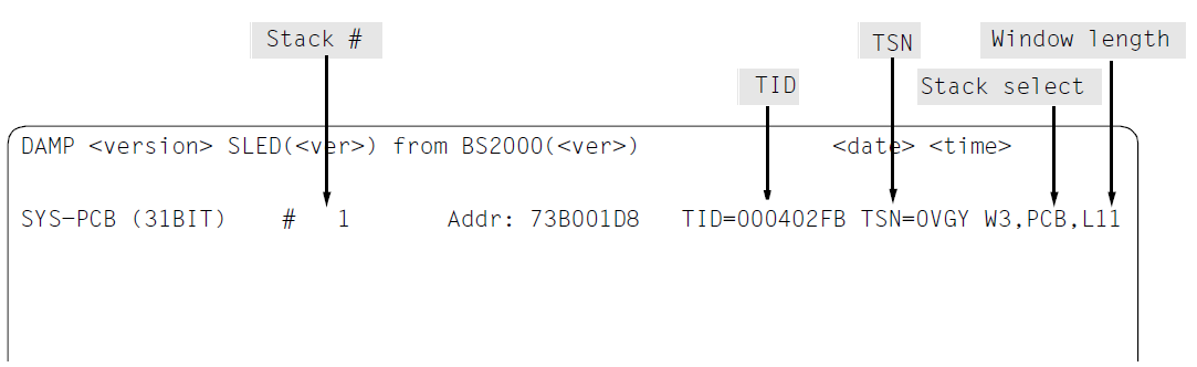The stack window displays the contents of the first TU or TPR stack or the contents of the TU or TPR stack that was selected and marked in window W2 (PCB mode), or the contents of a TPR program manager stack (SPL mode). The remaining information depends on the mode selected in the status window (W2).