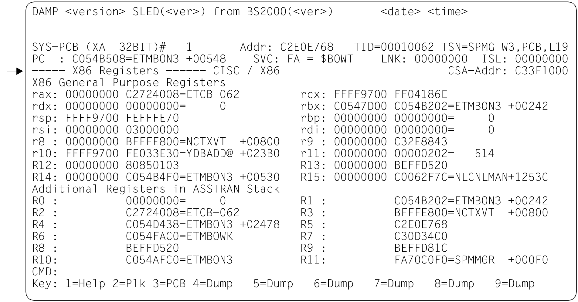 A PCB with an x86 context is presented with all 16 registers of x86 mode. An example of this is shown in figure 24. As a /390 context can be contained in registers r12 - r15, these registers are displayed in /390 register notation (R12 - R15). All other registers have the x86-specific names.
