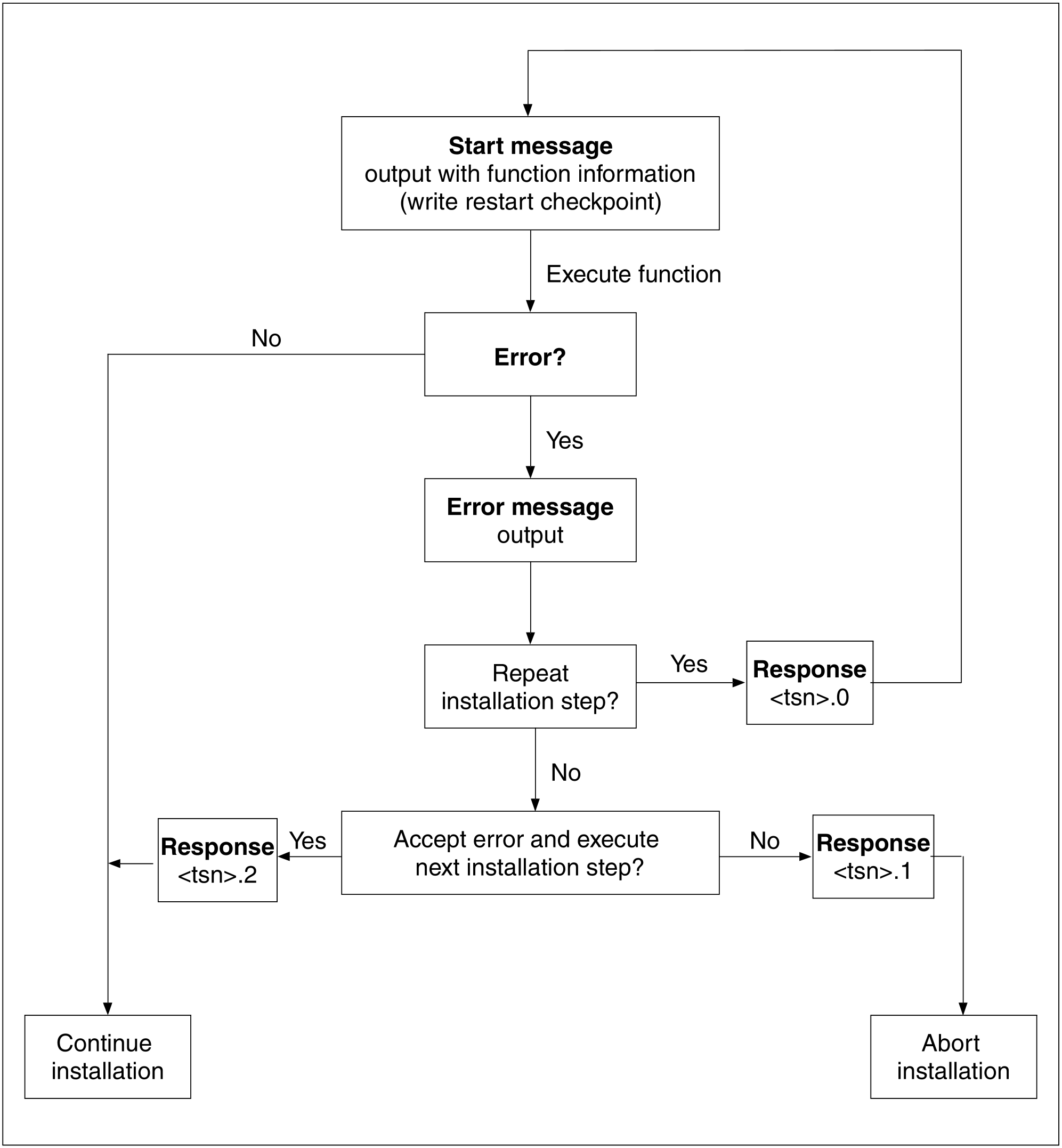<tsn>.2 | IGNORE: The error is ignored and must be rectified manually. Processing is continued at the next installation step. | The error should only be ignored in exceptional cases as during subsequent processing it will be assumed that the “defective” installation step was terminated without an error. This assumption can cause other errors under some circumstances. A restart is not possible. |