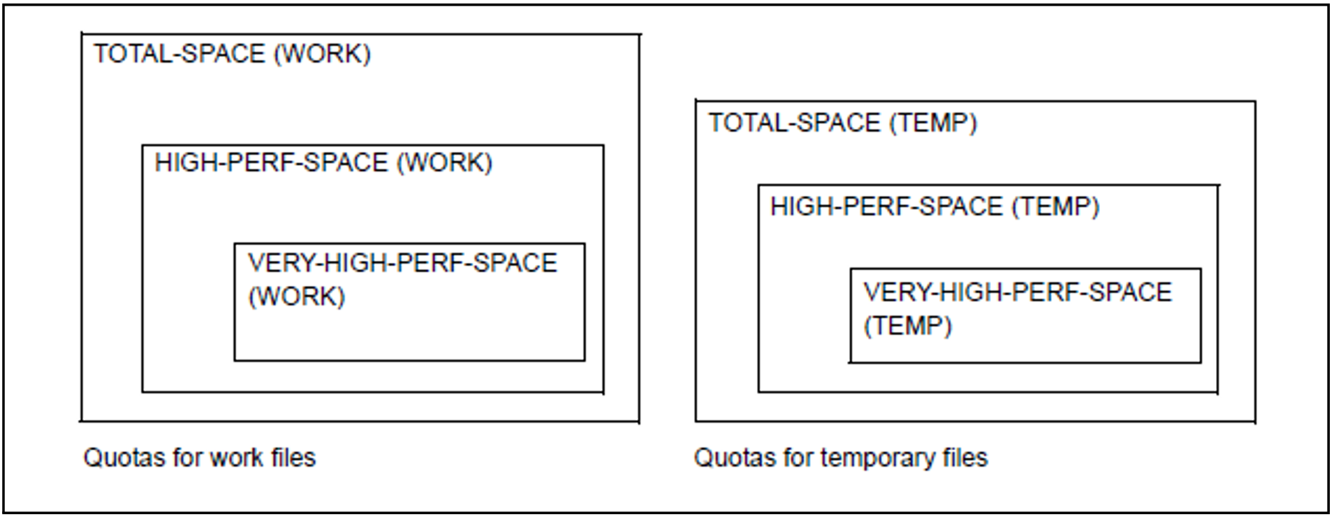 Temporary files and work files cannot be migrated to background levels or assigned the file attribute AVAILABILITY=*HIGH. This results in a temporary and work file quota structure which is simpler than that of permanent files.