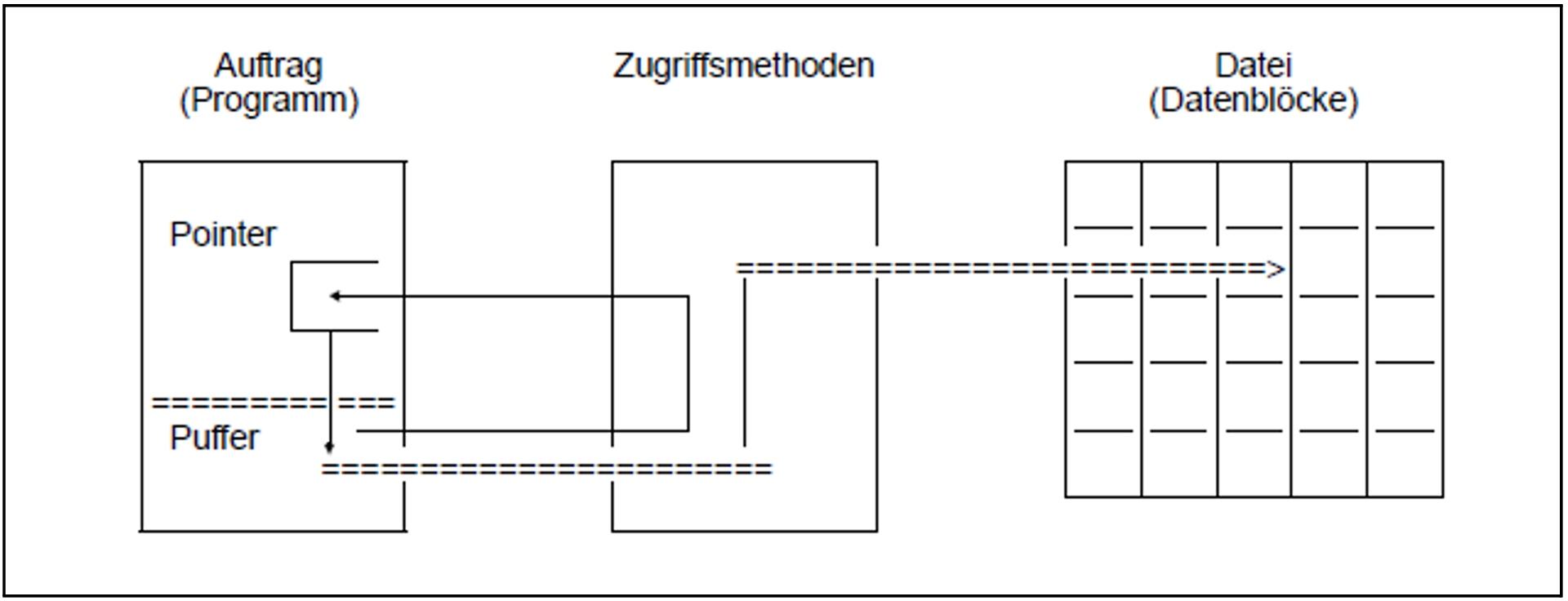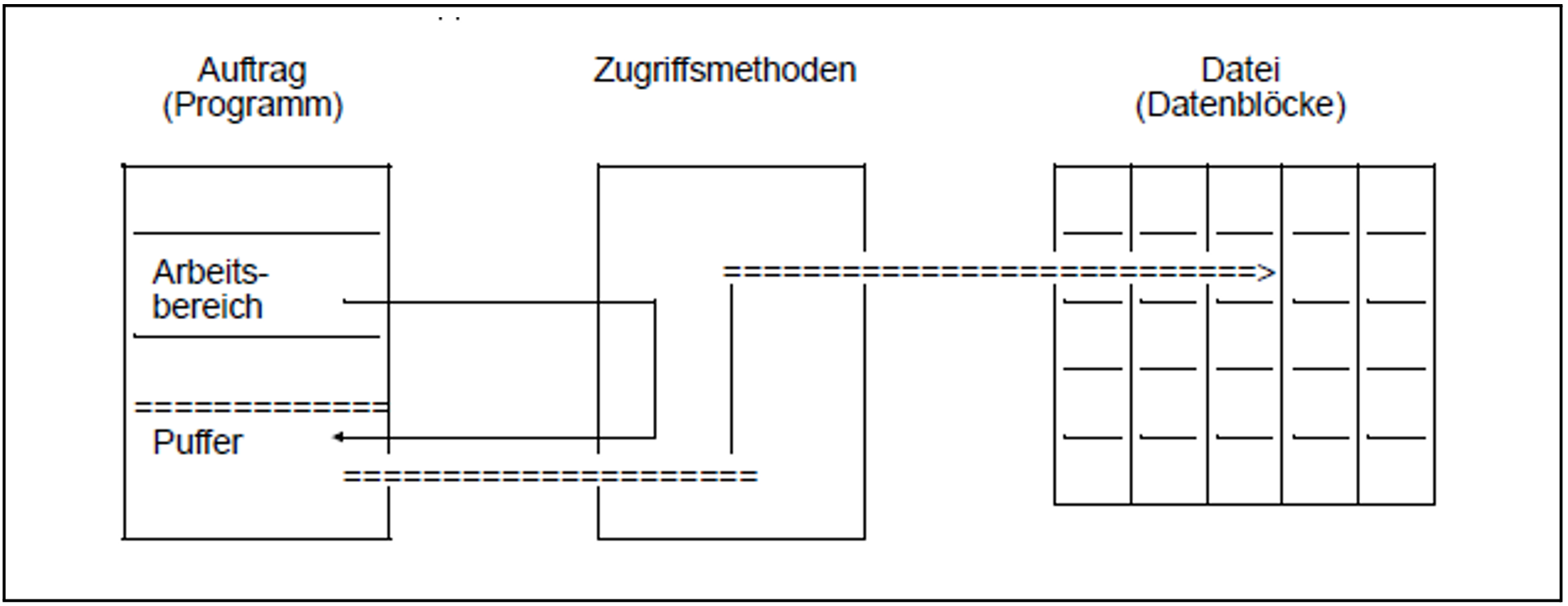 Basis der logischen Dateiverarbeitung ist der Datensatz. Auch bei satzweisem Zugriff werden Datenblöcke zwischen Peripherie und Pufferbereich übertragen. Das DVS übernimmt anschließend das Blocken bzw. Entblocken der Sätze und stellt dem Benutzerprogramm die benötigten Sätze zur Verfügung. Wenn beim Lesen der gesuchte Satz nicht im Puffer enthalten ist oder beim Schreiben der Puffer gefüllt ist, wird eine Datenübertragung ausgelöst: das DVS liest den nächsten Datenblock bzw. schreibt den Pufferinhalt als neuen Datenblock.