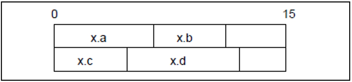 Die angegebene Anzahl von Bits wird ohne Ausrichtung angelegt, falls das Bitfeld noch ganz im aktuellen Byte, Halbwort, Wort oder Doppelwort Platz findet; andernfalls wird das Bitfeld entsprechend dem Grundtyp auf Byte-, Halbwort-, Wort- oder Doppelwortgrenze ausgerichtet (siehe Beispiel unten).