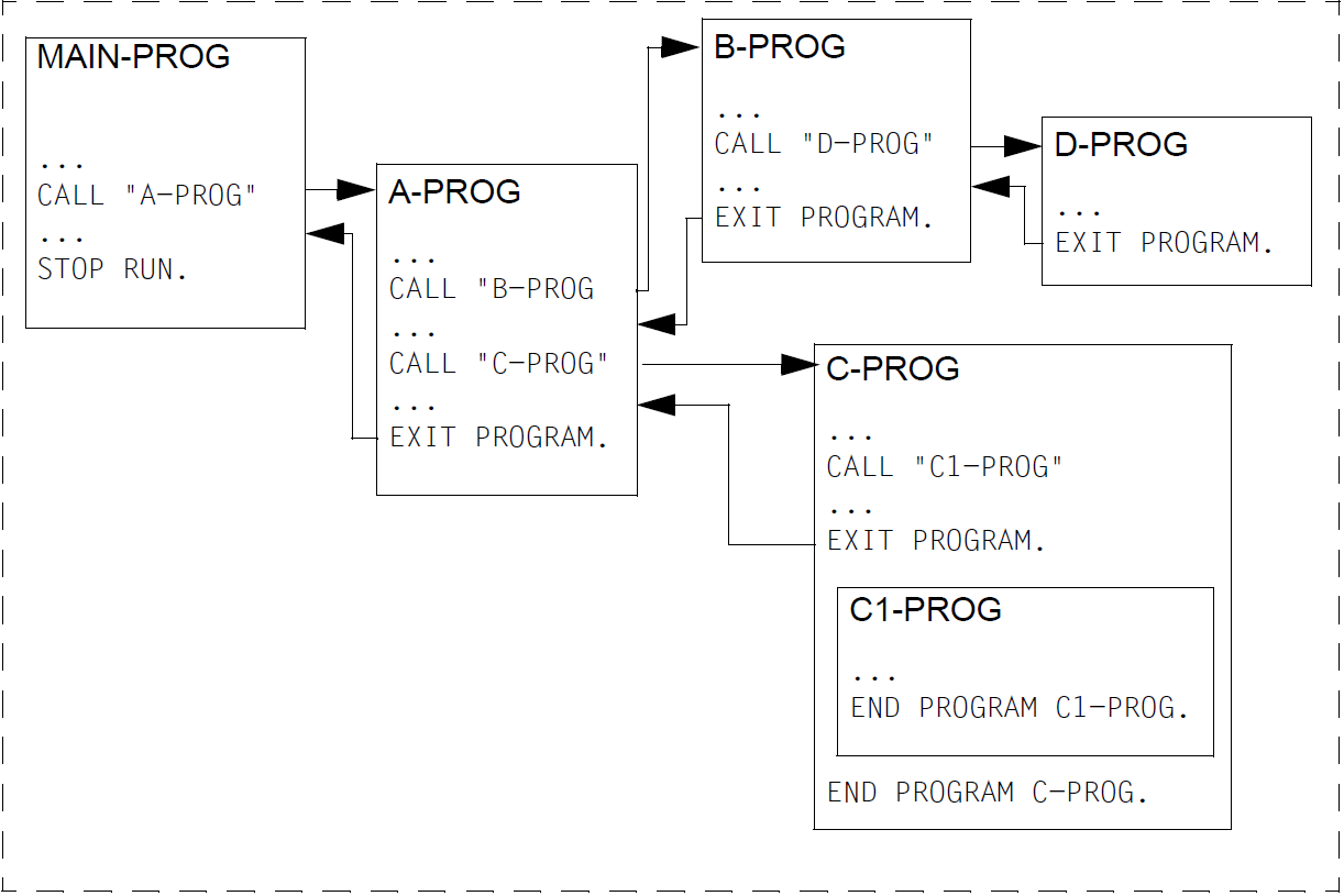 Die CALL-Anweisung übergibt die Programmsteuerung an das aufgerufene Programm. Von dort wird die Steuerung mittels der EXIT PROGRAM-Anweisung wieder an das aufru-fende Programm zurückgegeben. Das aufrufende Programm wird mit der auf die CALL-Anweisung folgenden Anweisung fortgesetzt.