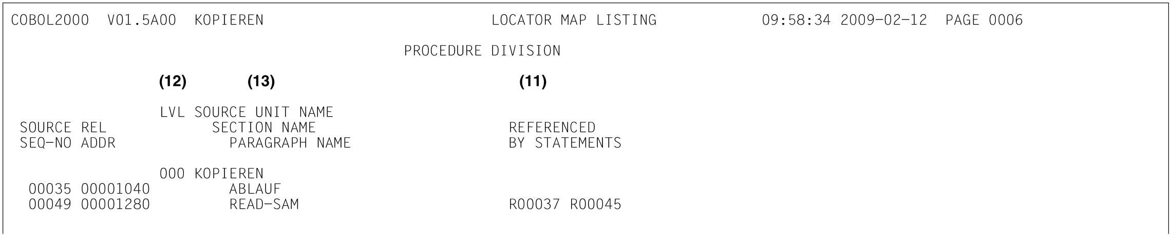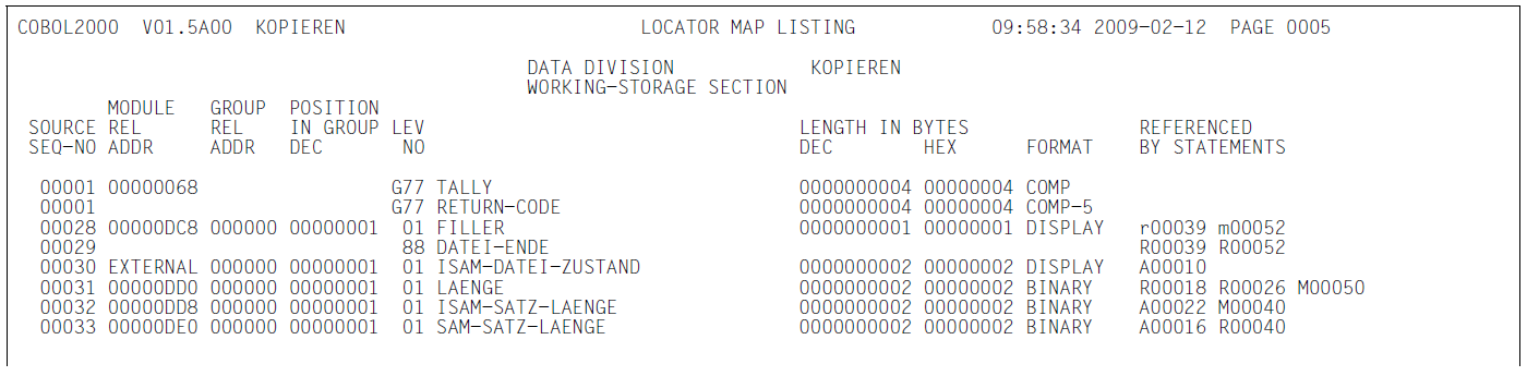 (11) | REFERENCED BY STATEMENTS Auflistung aller Übersetzungseinheit-Zeilennummern in aufsteigender Reihenfolge, in denen Anweisungen stehen, die auf die Datendefinition Bezug nehmen. Treten mehr Querverweise auf, als in die Zeile passen, werden Fortsetzungszeilen gebildet (siehe Parameter LINE-SIZE im Abschnitt „LISTING-Option"). Der Zeilennummer vorangestellt ist die Art der Bezugnahme: M | modify/schreibend | R | read/lesend | A | addressing/adressierend | Die entsprechenden Kleinbuchstaben zeigen implizite Zugriffe an (das betrifft zum Beispiel korrespondierende untergeordnete Felder bei MOVE CORRESPONDING oder das Datenfeld, auf das sich ein Bedingungsname bezieht). |