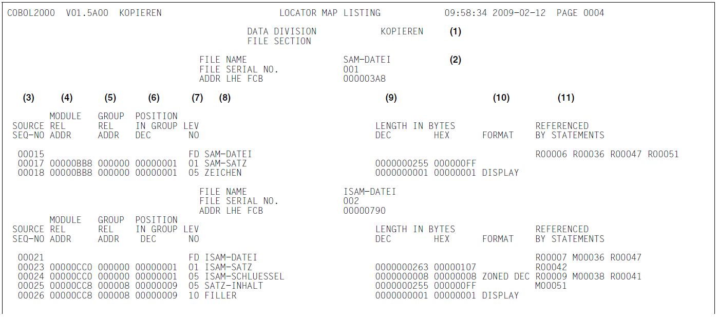 (1) (2) | Angabe des Programmteils, des Kapitels und des Programmnamens Dateiname, Dateifolgenummer und Adresse des Dateisteuerblocks aller im Programm verwendeten Dateien |