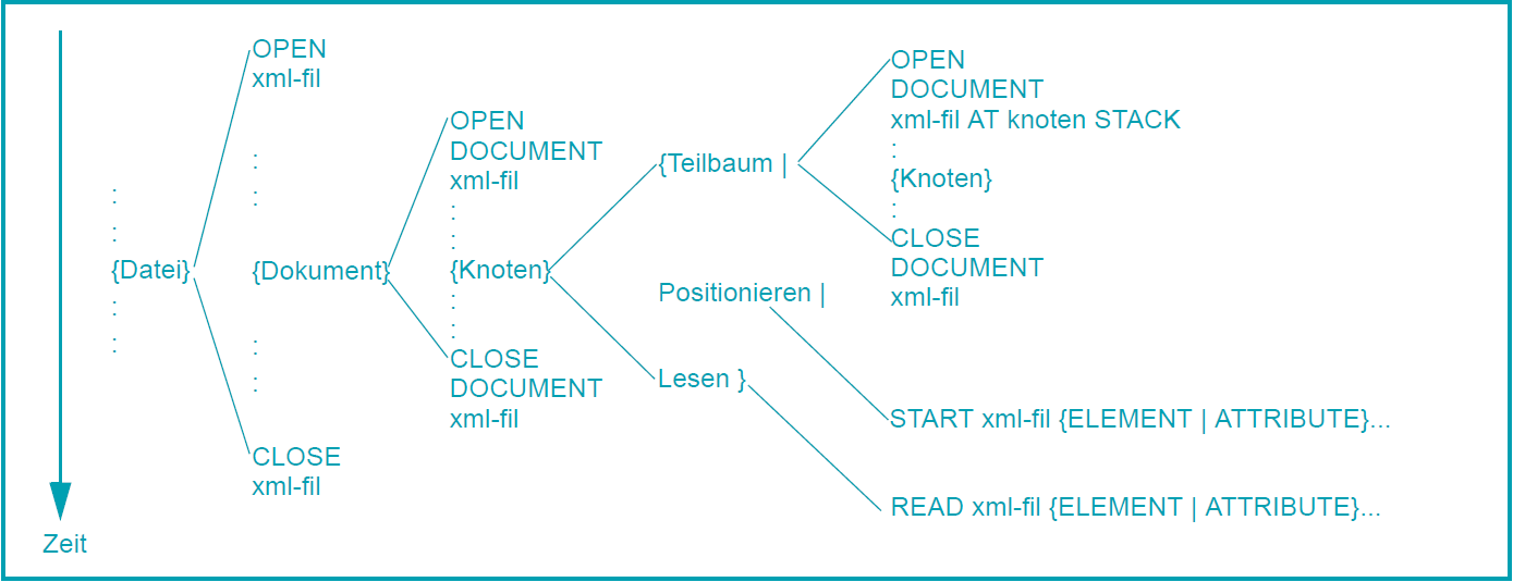 Entsprechend der an die Dateiverarbeitung angelehnten Beschreibung von XML-Dokumenten erfolgt auch die Verarbeitung von XML-Dokumenten mit Hilfe der leicht erweiterten Anweisungen für Dateiverarbeitung: