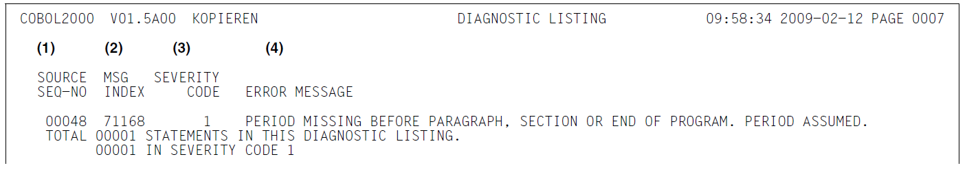 (4) | ERROR MESSAGE | enthält den erklärenden Text und gegebenenfalls die von COBOL2000 durchgeführte Korrektur oder einen von COBOL2000 angenommenen Standardwert. |