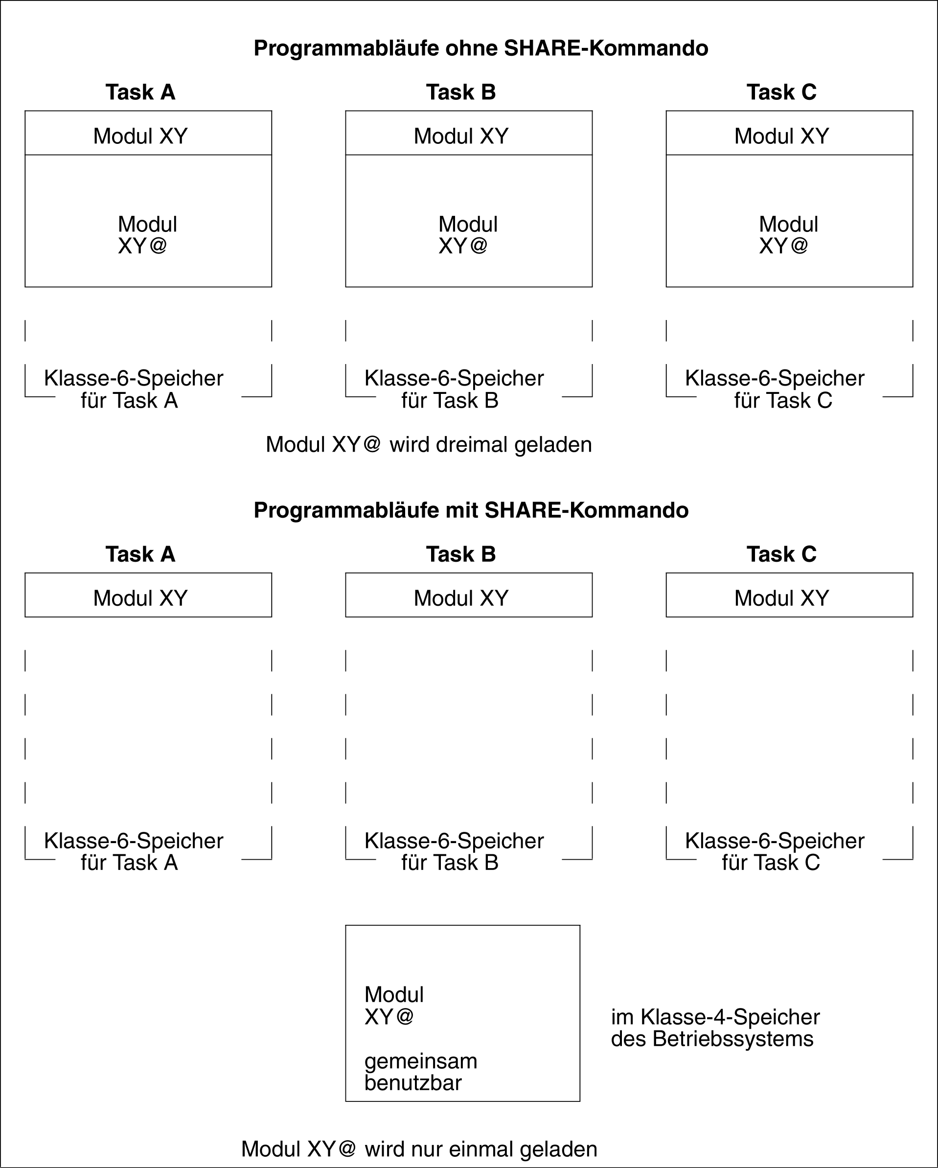 Die gemeinsam benutzbaren Module müssen entweder unmittelbar vom Compiler (über COMOPT-Anweisung MODULE bzw. SDF-Option MODULE-LIBRARY) oder mit dem Dienstprogramm LMS (siehe Handbuch [11]) in einer PLAM-Bibliothek abgelegt werden.