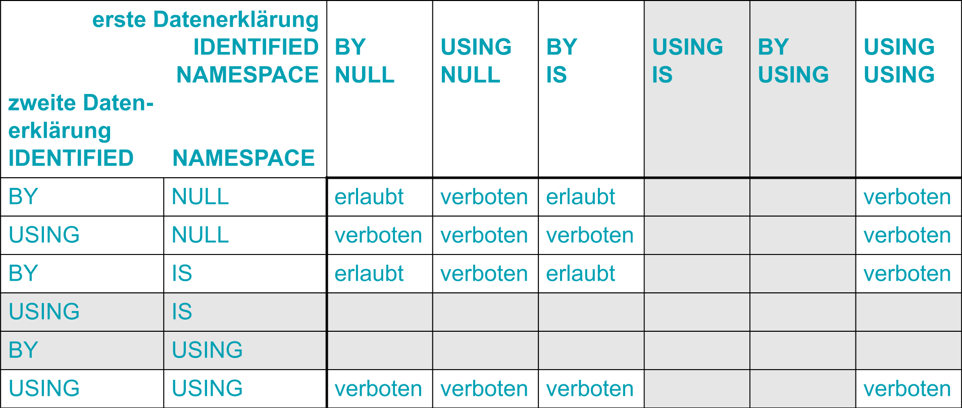 Tabelle 43: Erlaubte Kombination von IDENTIFIED- und NAMESPACE-Angabe in einer IDENTIFIED-Klausel