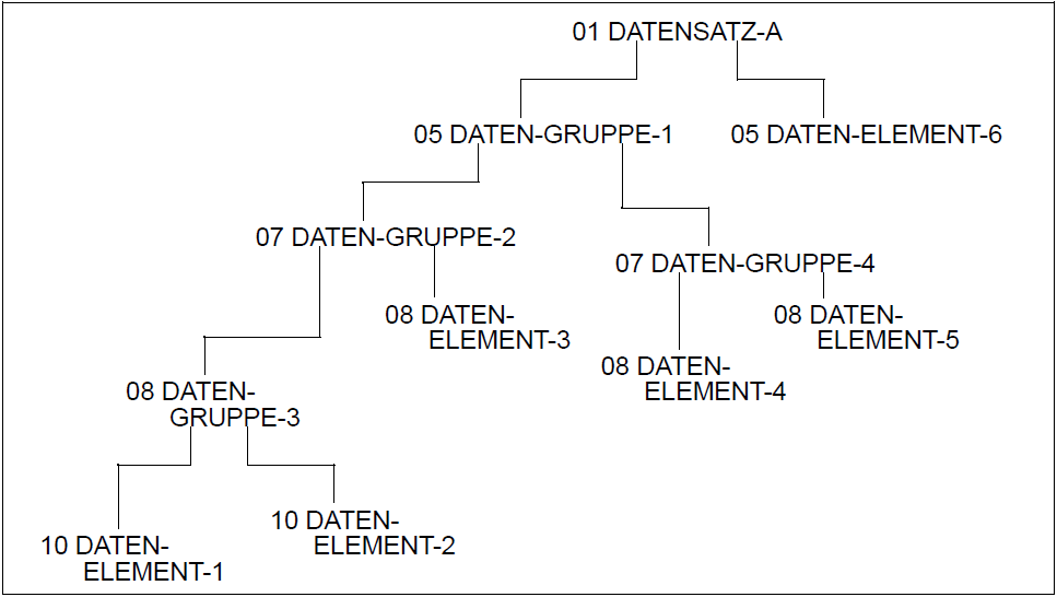 01 DATENSATZ-A. 05 DATEN-GRUPPE-1. 07 DATEN-GRUPPE-2. 08 DATEN-GRUPPE-3. 10 DATEN-ELEMENT-1... 10 DATEN-ELEMENT-2... 08 DATEN-ELEMENT-3... 07 DATEN-GRUPPE-4. 08 DATEN-ELEMENT-4... 08 DATEN-ELEMENT-5... 05 DATEN-ELEMENT-6...Bild 2: Datengruppen und Datenelemente in einem Datensatz