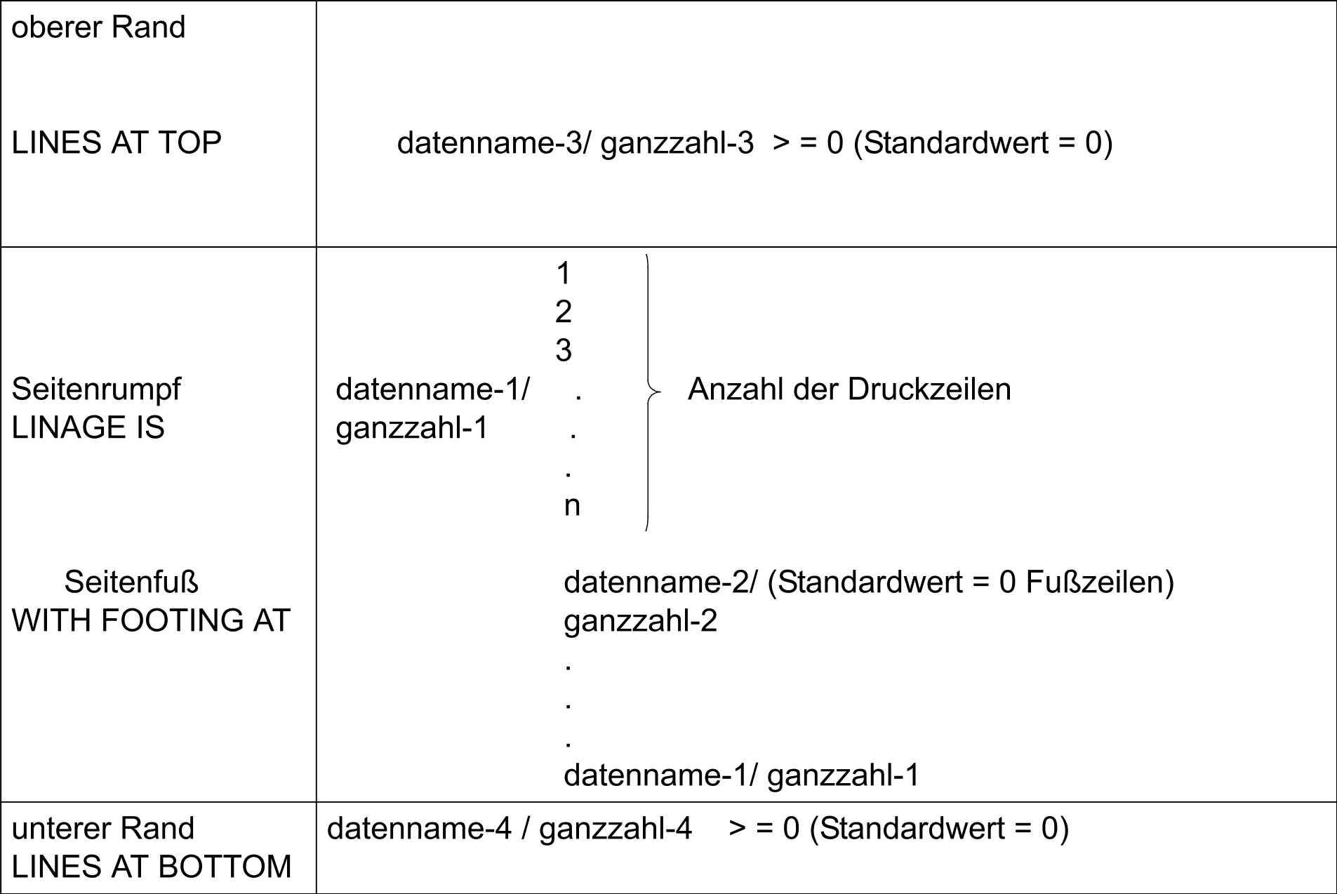 Mit Hilfe der LINAGE-Klausel kann man die Größe einer logischen Seite in Form der Zeilenzahl bestimmen. Die logische Seitengröße ergibt sich aus der Summe aller Angaben aus der LINAGE-Klausel mit Ausnahme der FOOTING-Angabe. Ist LINES AT TOP oder LINES AT BOTTOM nicht angegeben, so ist der Wert dieser Funktion 0. Fehlt die Angabe für FOOTING, so ist kein Seitenfuß definiert (siehe Tabelle 11).