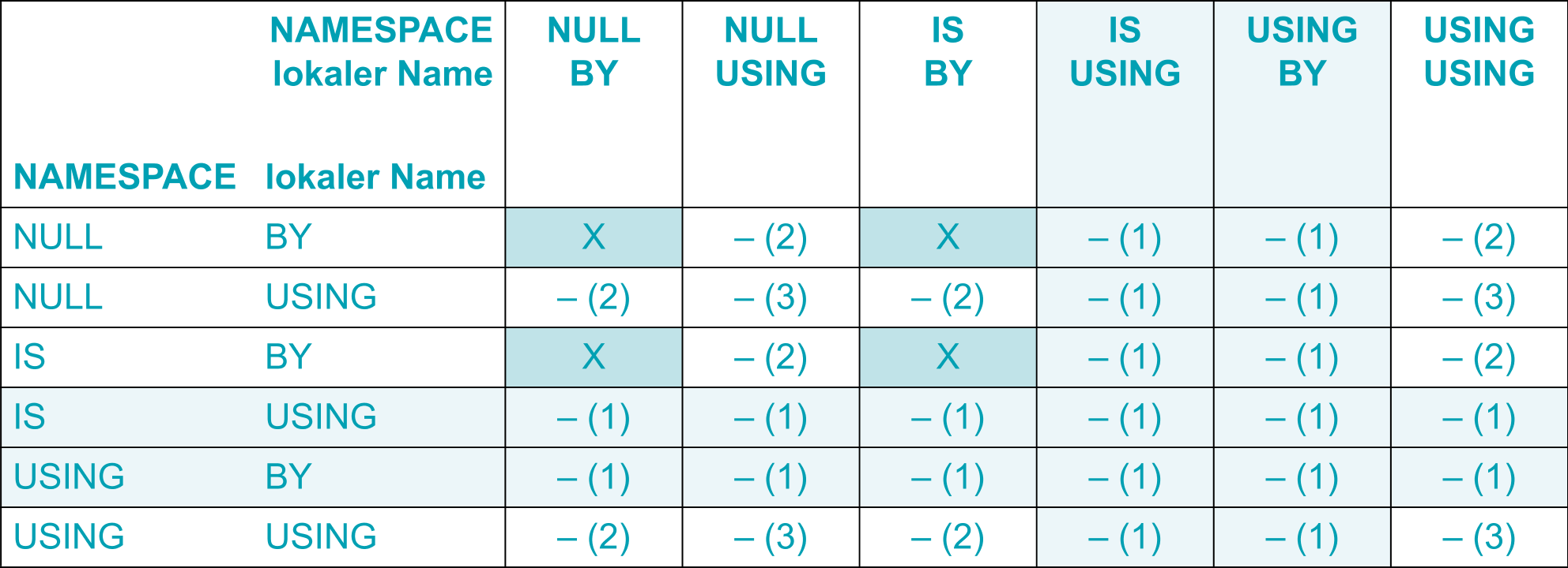 Die nachfolgende Tabelle gibt einen Überblick über erlaubte Kombinationen der Angaben von BY bzw. USING bei zwei Datenerklärungen mit IDENTIFIED-Klauseln mit gleicher An-gabe der Art. D.h. die Verbote gelten jeweils nur innerhalb der Menge von IDENTIFIED-Klauseln, die alle die ELEMENT- bzw. alle die ATTRIBUTE-Angabe machen. Für Mischungen gibt es keine Einschränkungen. Es ist also zulässig, einem Datenfeld zwei Datenfelder mit IDENTIFIED BY...ATTRIBUTE und IDENTIFIED USING...ELEMENT direkt unterzuordnen.