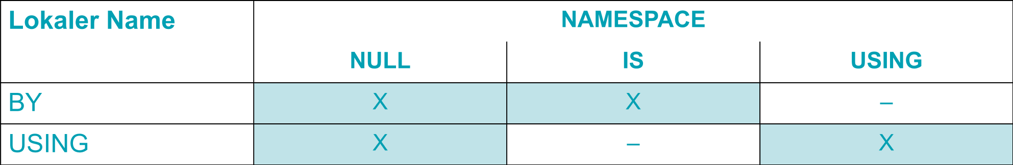 Die Wirkung entspricht der USING-Angabe bei IDENTIFIED: In datenname-4 wird der gelesene Namensraum zurückgeliefert.den leeren Namensraum festzulegen: NAMESPACE IS NULL
