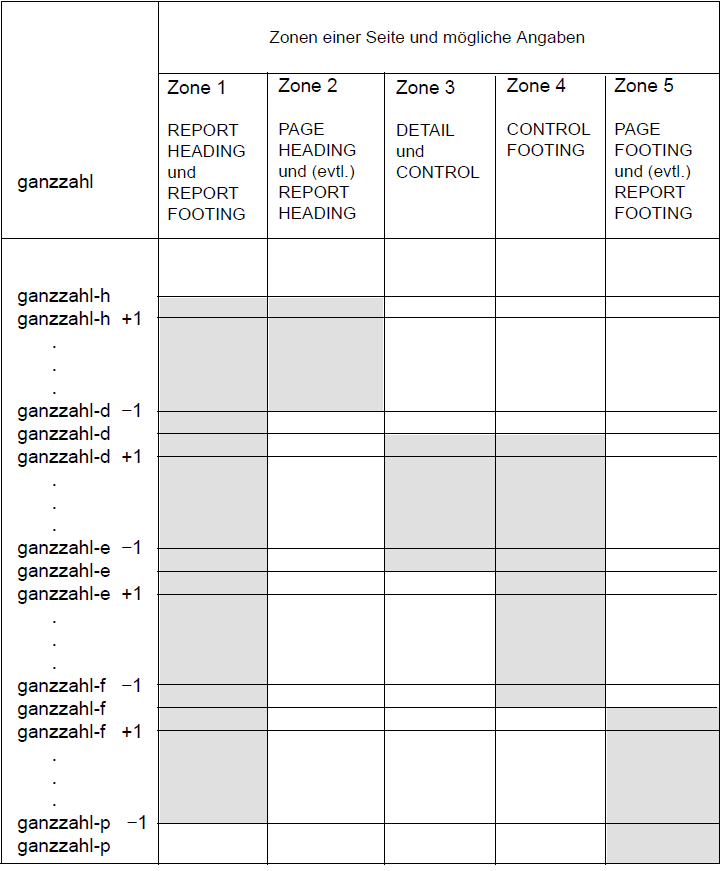 In Tabelle 39 wird schematisch die Aufteilung der Seite in Zonen für den Fall dargestellt, dass alle Ganzzahlen der PAGE LIMIT-Klausel verschiedene Werte aufweisen mit