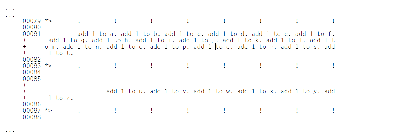 Zeilen, die nicht länger als 80 Zeichen sind, werden wie bisher unter voller Ausnutzung des verfügbaren Platzes aufgelistet. Eine Zeile mit einer Länge von 81 bis 160 Zeichen wird in eine Teilzeile mit 80 Zeichen und in eine kürzere Teilzeile mit 1 bis 80 Zeichen zerlegt. Letztere Teilzeile erhält zur Kennzeichnung keine vorangestellte Zeilennummer, sondern nur ein einzelnes „+“-Zeichen.