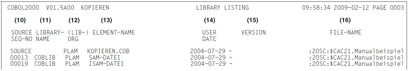 Als zweiter Teil der Übersetzungseinheitliste wird eine Bibliotheksliste ausgegeben. Ihr sind die Quellen zu entnehmen, aus denen das in dieser Übersetzung bearbeitete COBOL-Programm entstand. Für jede COPY-Anweisung wird eine Zeile angelegt, die folgende Informationen enthält: