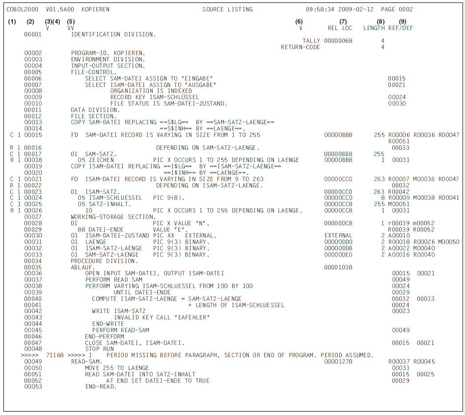 Im Listenbeispiel sind die Übersetzungsmeldungen „eingemischt“ (siehe Parameter INSERT-ERROR-MSG im Abschnitt „LISTING-Option").