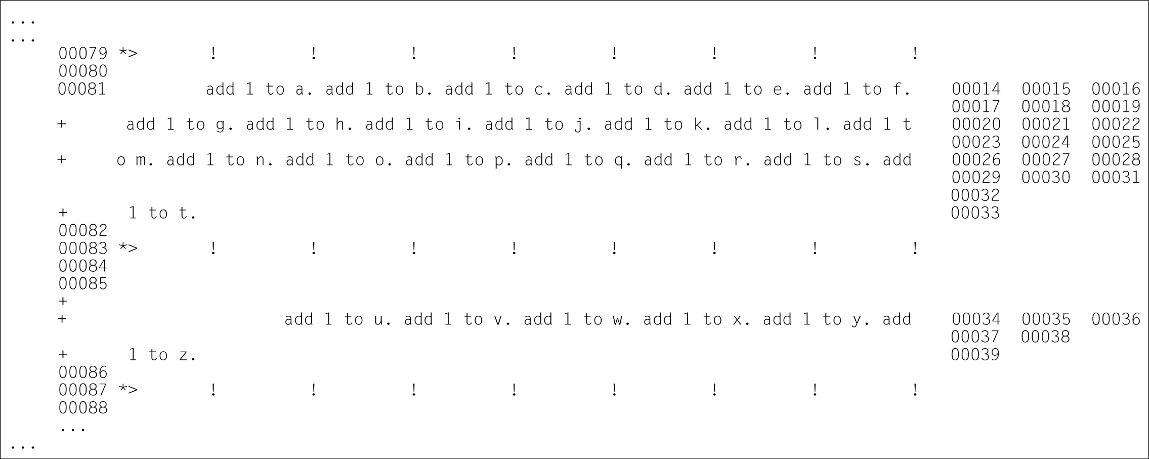Da die XREF-Ausgaben gelegentlich den Einschub zusätzlicher Leerzeilen erzwingen, ist nur durch das „+“Zeichen am Zeilenanfang erkennbar, ob eine solche eingeschobene Zeile wegen der XREF-Einträge generiert wurde, oder ob sie tatsächlich eine echte Teilzeile ist, die zufällig nur Leerzeichen enthält (siehe Beispiel Zeile 00085).