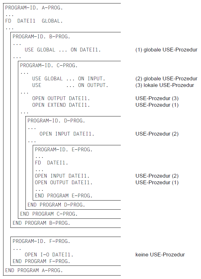 Beansprucht eine Ein-/Ausgabeanweisung eine USE-Prozedur, so wird die gültige USE-Prozedur aus der Menge aller in dem geschachtelten Programm vereinbarten USE-Prozeduren nach folgenden Präzedenzregeln ausgewählt: