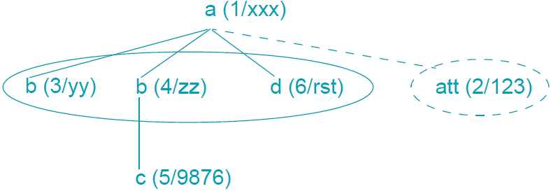 ’a’ ist der Vater der beiden 'b', des 'd' und des 'att'-Knoten