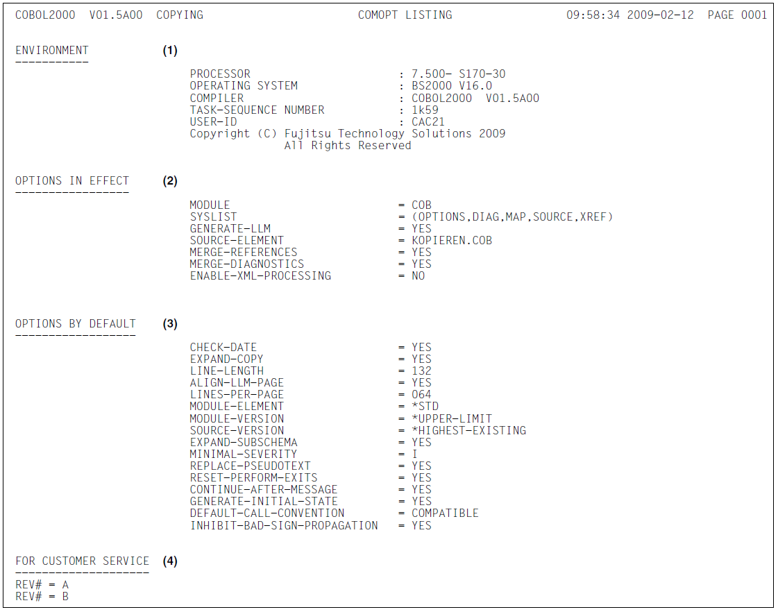 (2) | the selected compiler options (OPTIONS IN EFFECT; COMOPTs), |