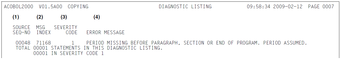 (3) | SEVERITY CODE | indicates the error class (see table 37 in section "Messages of the COBOL2000 system"). |