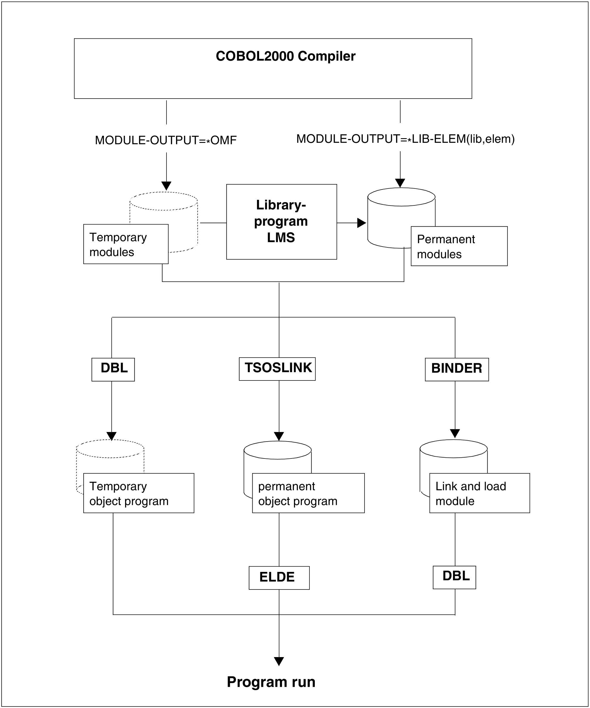 The COBOL2000 compiler generates object modules or LLMs at compilation. Object modules are placed in the temporary EAM file of the current task or in a PLAM library as an element of type R.