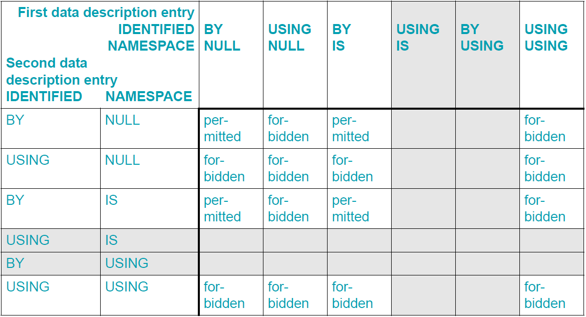 Table 44: Permitted combination of two data description entries with IDENTIFIED and NAMESPACE phrases