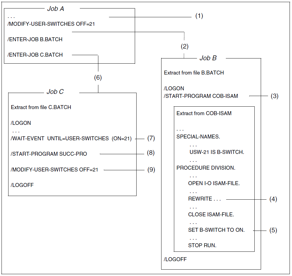 In the following extract, interactive job A generates two batch jobs, B and C. In job B, an ISAM file is updated. Job C can only execute after this takes place. User switch 21 is used in three different jobs. It is set at program level, and evaluated and reset at operating system level.