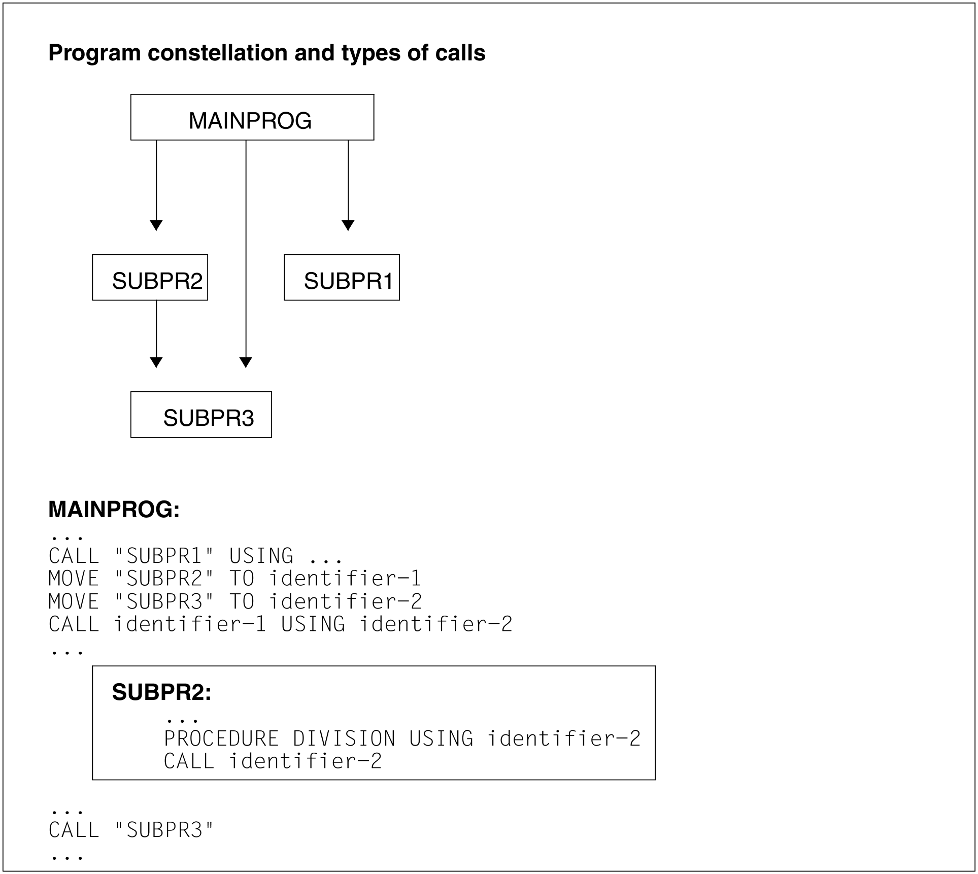 The name of a subprogram can be specified in the CALL statement either as a literal or as the identifier of a data item that contains the subprogram name or subprogram address. Depending on the kind of subprogram call, a program system is linked and loaded in different ways.