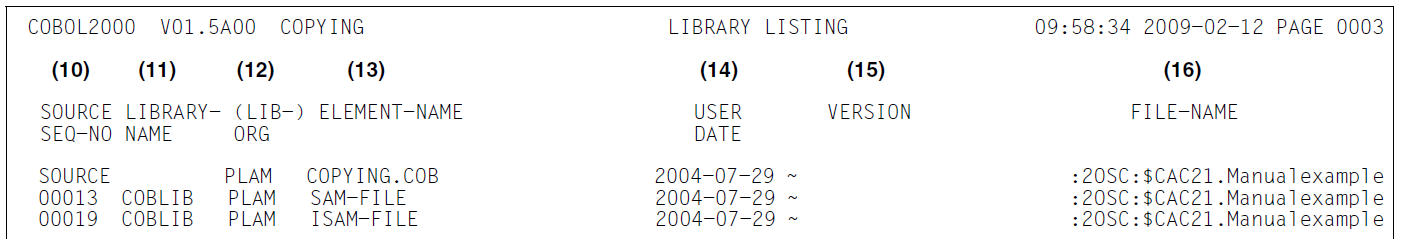 A library listing is output as the second part of the source listing. The sources from which the COBOL program processed in this compilation run was created can be found in this library listing. A line is created for each COPY statement, containing the following information: