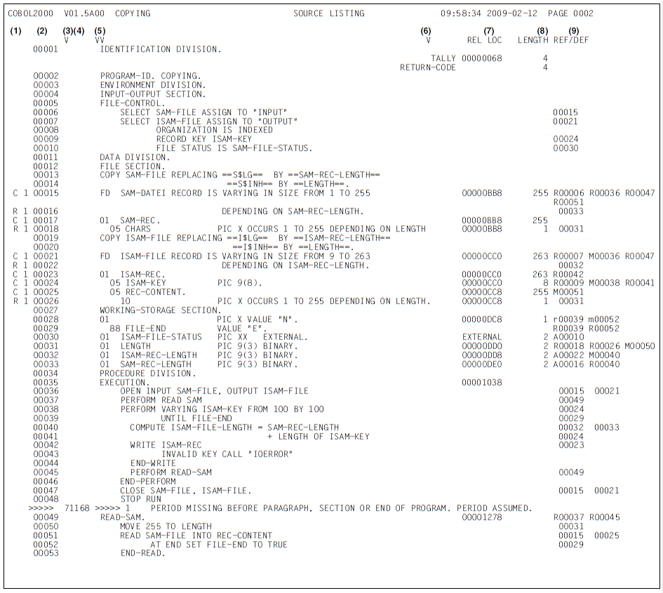 (1) | Indicator field Column 1 gives information about errors in the user-defined numbering of the input records (S flag) and about any violations of the maximum line length of 80 characters in fixed format resp. 248 characters in free format (T flag). Furthermore, it identifies records copied from a COPY library (C flag), declared by a REPLACING or REPLACE (R flag) or associated with the Sub-schema Section (D flag). Column 3 shows the nesting depth for expanded COPY elements. A minus sign (-) in column 1 identifies lines that have been ignored because of |