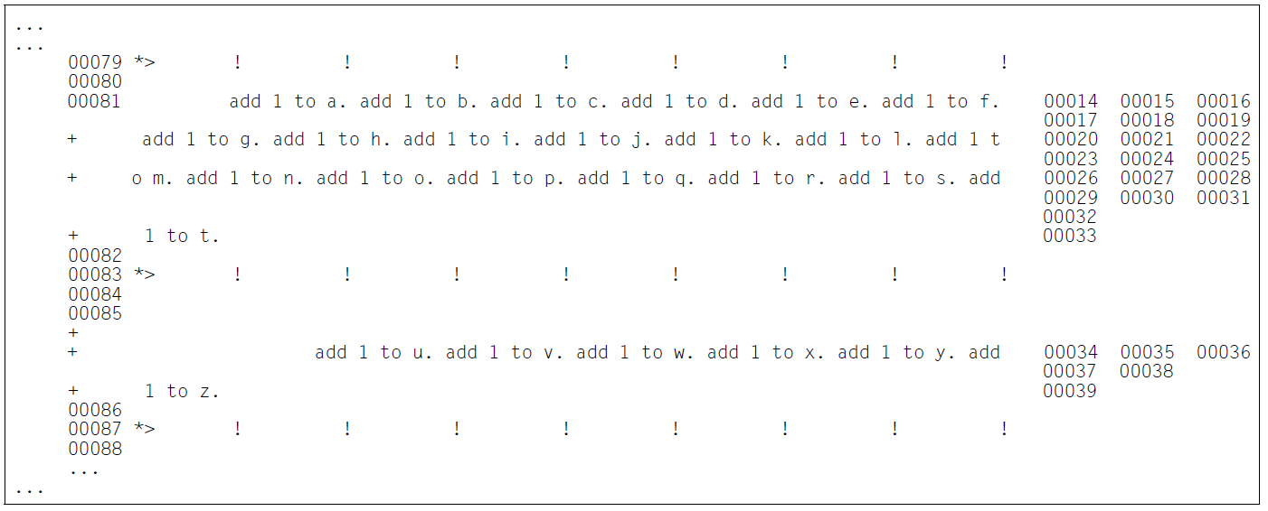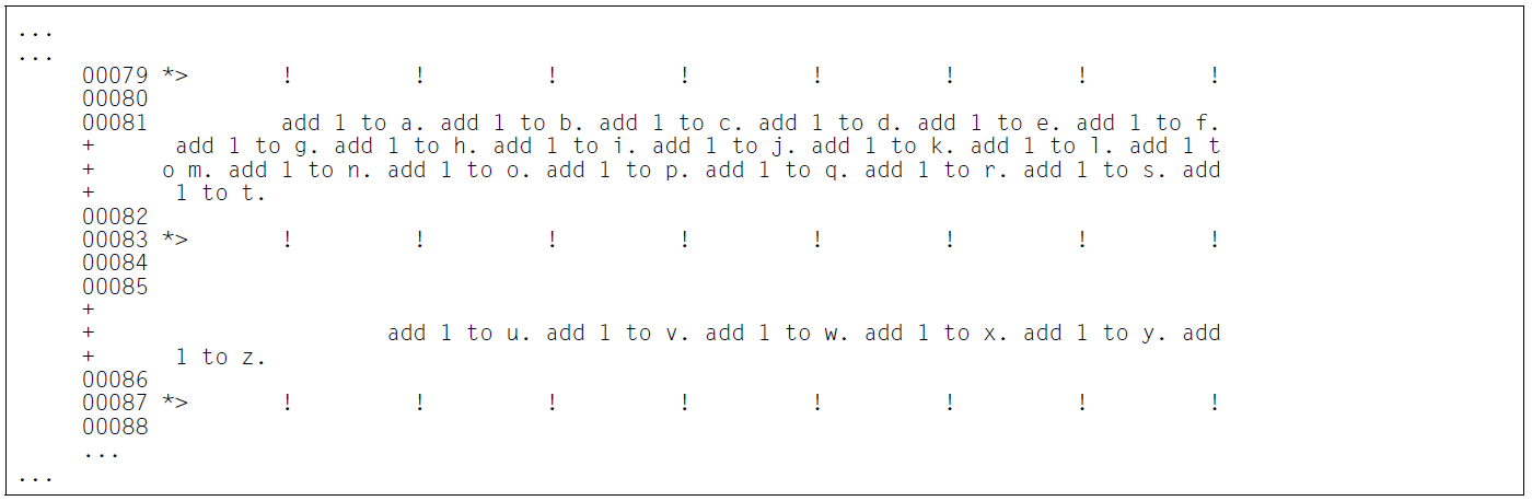 Lines which are not longer than 80 characters a listed as previously, making full use of the available space. A line which is 81 to 160 characters long is divided into a partial line with 80 characters and a smaller partial line containing 1 to 80 characters. The latter partial line is not assigned a preceding line number for identification purposes, but only a single “+” character.