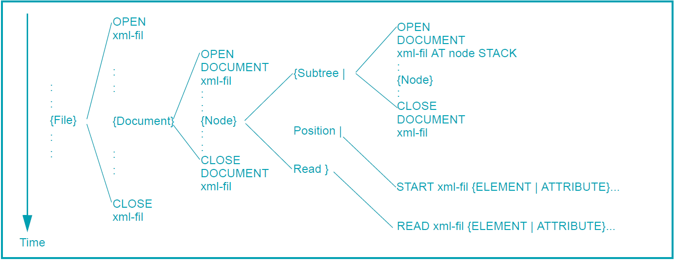 In accordance with the description of XML documents which is based on file processing, XML documents are also processed using slightly extended statements for file processing: