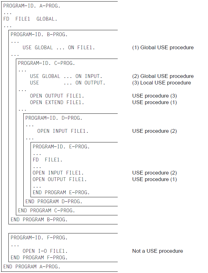 If an I-O statement requires the use of a USE procedure, then the valid USE procedure is selected from the sum total of all the USE procedures declared in the nested program, in accordance with the following rules of precedence: