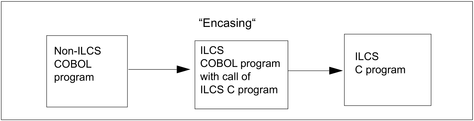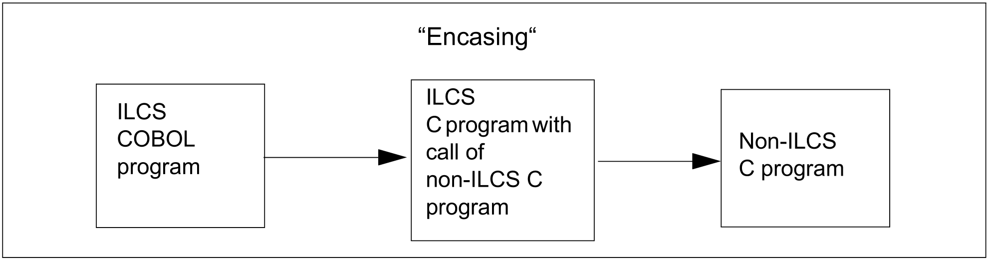Linking non-ILCS programs to ILCS programs in a different language is only possible if the non-ILCS programs are “encased” (or “encapsulated”) by ILCS programs of the same language, i.e. the user must write a program which calls the non-ILCS program and must compile this program by means of an ILCS-compatible compiler