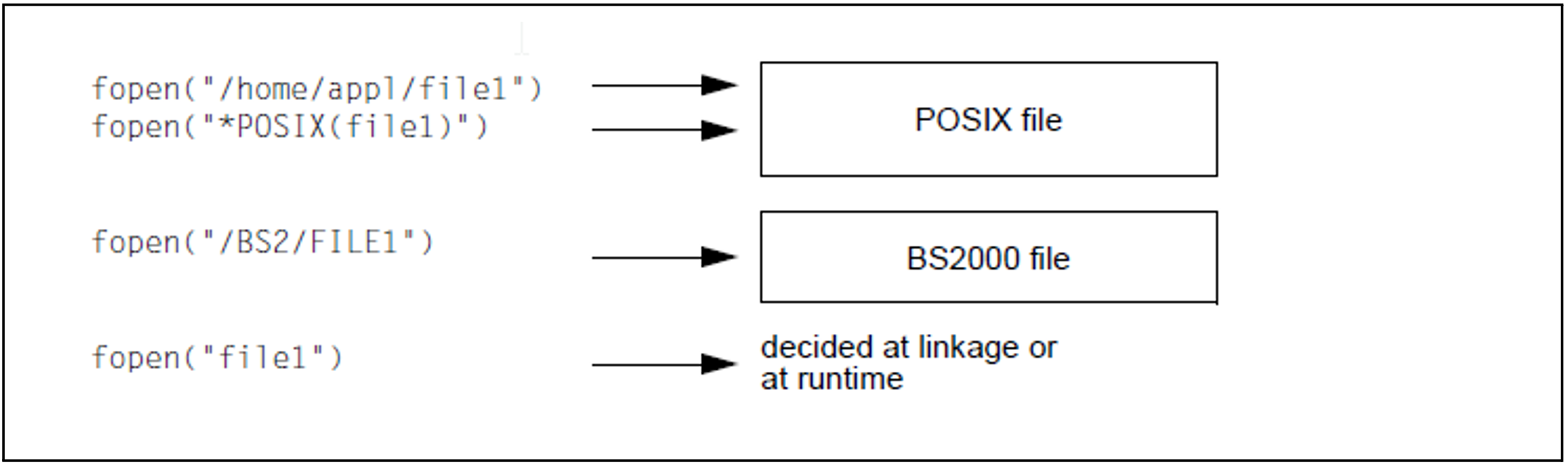 If a BS2000 file is to be processed, the file name must be qualified with /BS2/. As soon as a BS2000 file is accessed, the BS2000 functionality of the corresponding function applies. Deviations from the XPG4 functionality, if any, are indicated by the marker BS2000 in the left margin of all relevant descriptions.