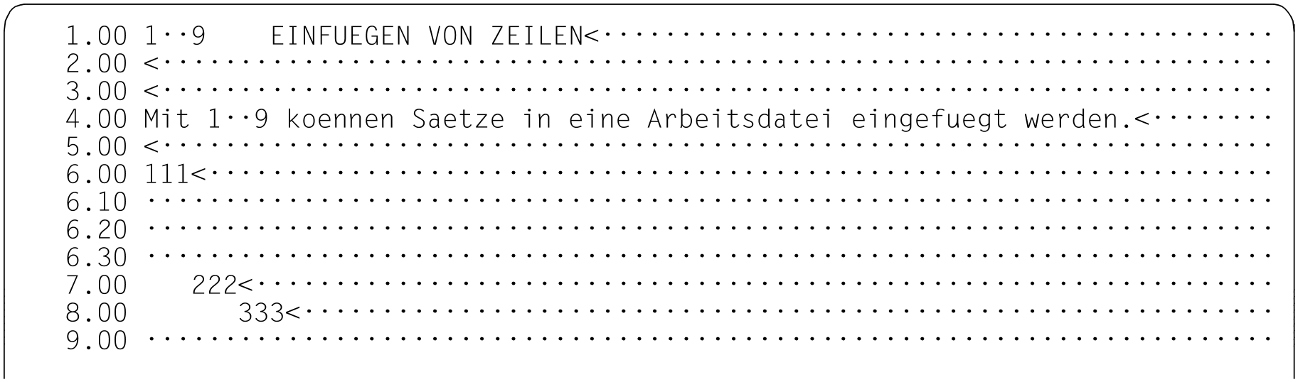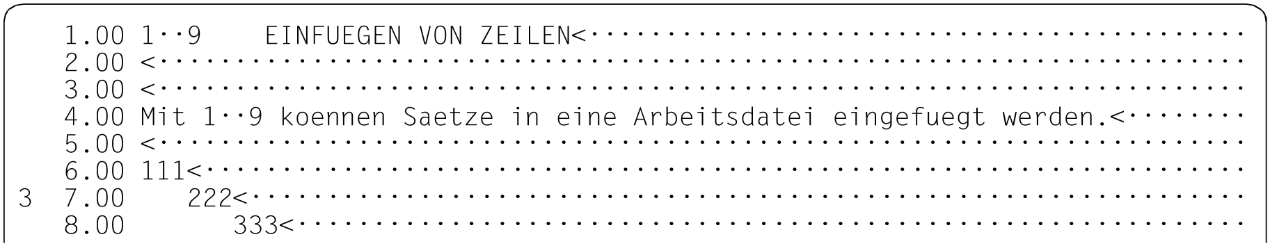 Die Kurzanweisungen 1..9 dienen dazu, am Bildschirm vor der angegebenen Zeile neue Zeilen bereitzustellen. Sie können mit Text gefüllt und nach der Datenübertragung in die Arbeitsdatei eingefügt werden. Zur Unterscheidung zwischen neuen Zeilen und Leerzeilen (die Sätzen der Länge 0 entsprechen) siehe den Abschnitt „F-Modus“.