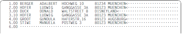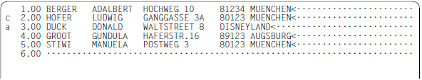 Die Kurzanweisung A kopiert oder verschiebt Datensätze, deren Zeilennummern mit C, M oder R im Kopierpuffer aufgesammelt wurden, hinter (after) die angegebene Zeile. Wurde der Kopierpuffer mit den Kurzanweisungen C oder M gefüllt, wird er anschließend gelöscht.