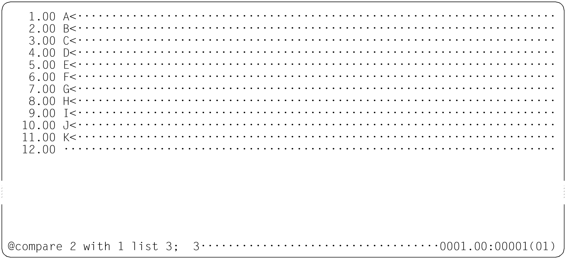 Für Zeilen gleichen Inhalts werden die identifizierten Zeilennummern in der Form 0001.00=0006.00 ausgegeben. Sind mehrere aufeinander folgende Sätze gleich (Bereich gleicher Sätze), wird nur das erste und letzte Zeilennummernpaar des Bereiches angegeben (Näheres siehe Beispiel).