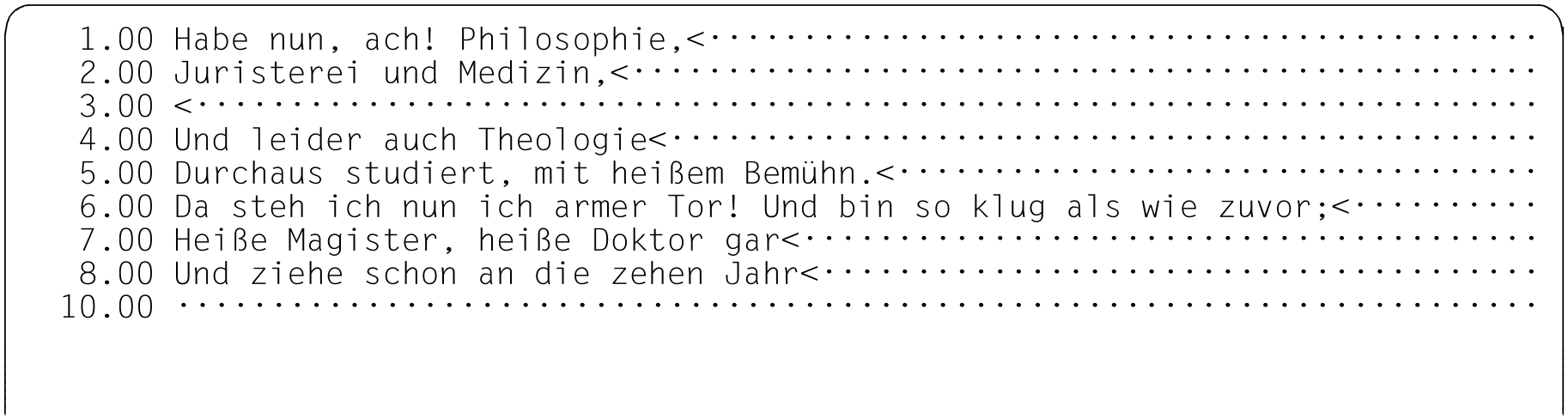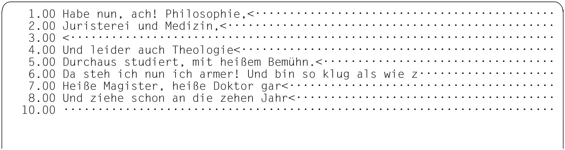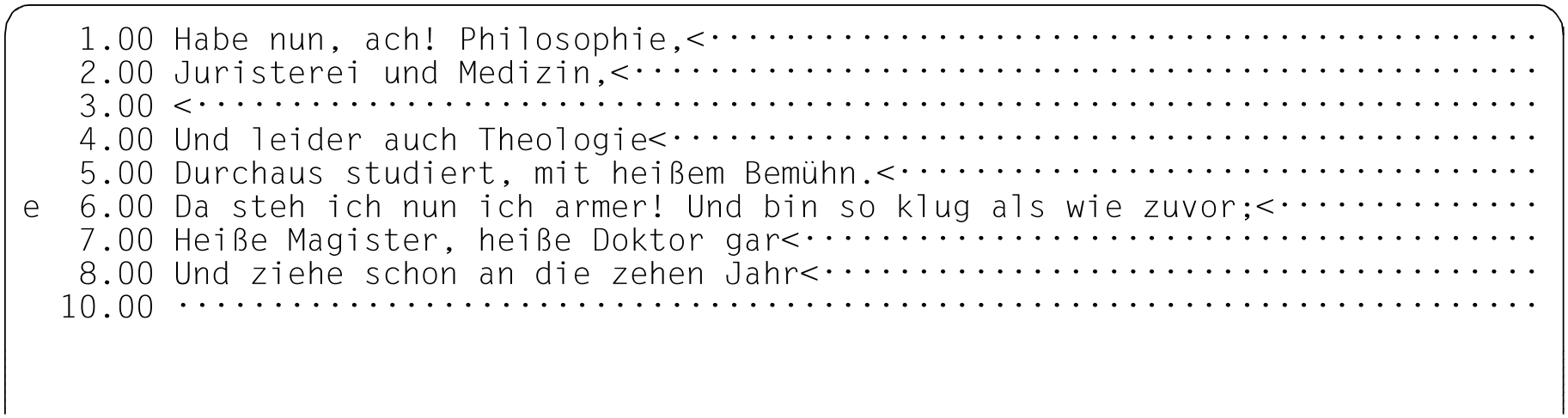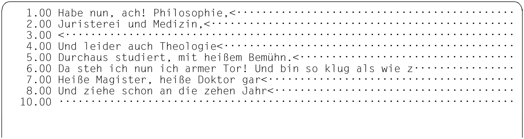 Da in Zeile 6.00 weniger als 20 Zeichen eingegeben wurden, rückt der EDT den verschobenen Zeilenrest ins Datenfenster nach.