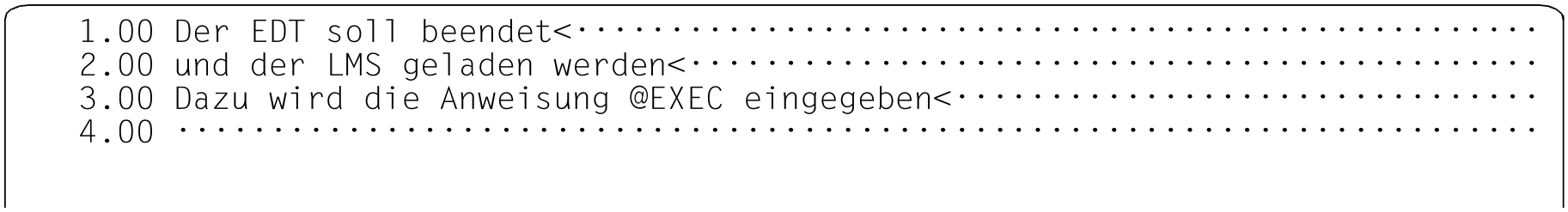Daher kann bei Aufruf des EDT als Unterprogramm die Anweisung @EXEC für den Benutzer verboten werden. Sie wird dann mit der Meldung EDT4976 abgewiesen.