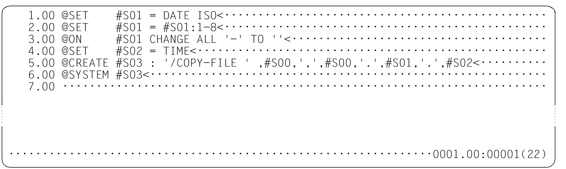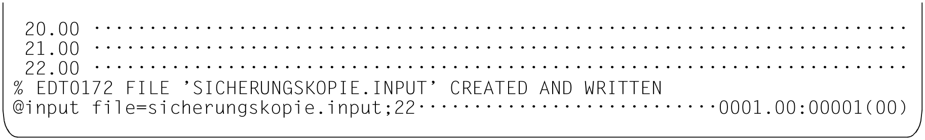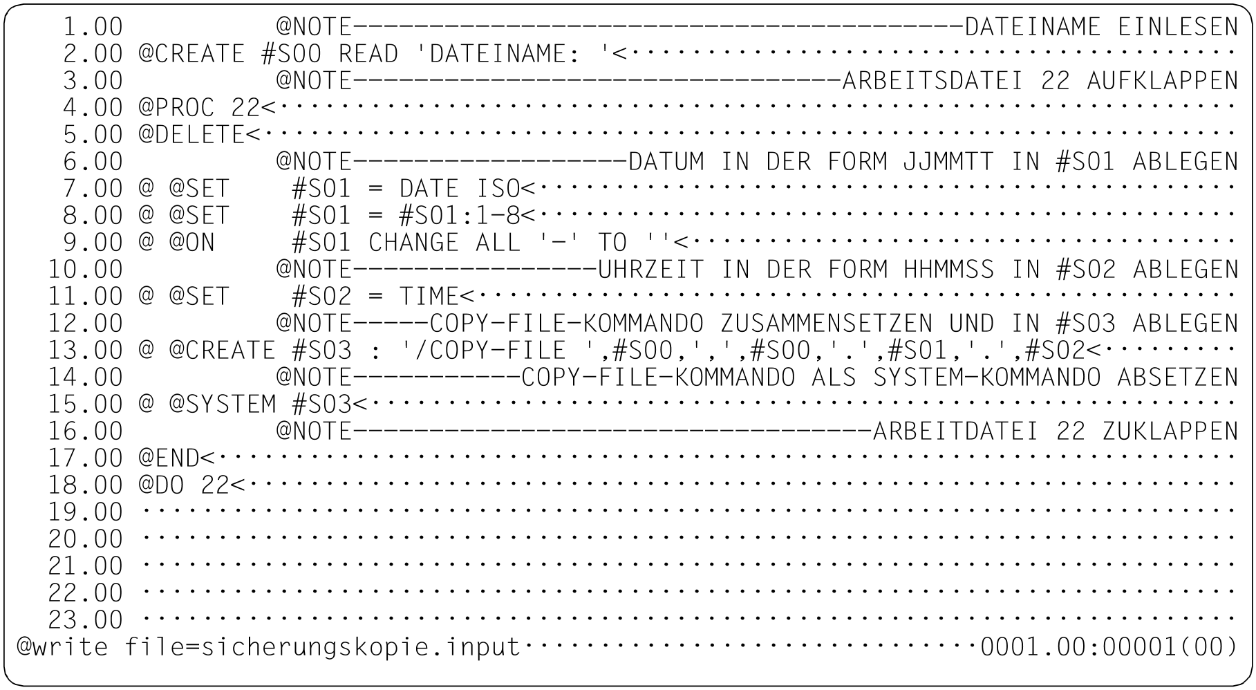 Durch @INPUT wird die Prozedur aufgerufen. Die Anweisungen der SAM-Datei SICHERUNGSKOPIE.INPUT werden abgearbeitet. Dabei wird die geschachtelte @DO-Prozedur (Zeilen 6.00 bis 16.00, EDT-Anweisungen mit mehr als einem Anweisungssymbol @) in der Arbeitsdatei 22 abgelegt (siehe weiter unten) und gleich ausgeführt. Anschließend wird in die Arbeitsdatei 22 gewechselt.